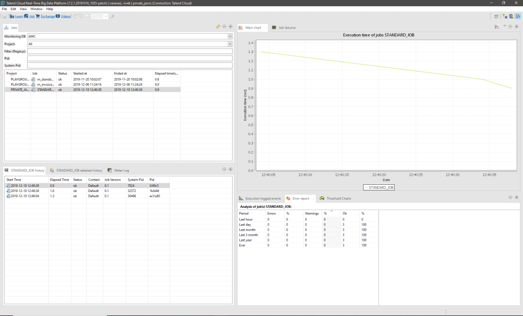 Talend Activity Monitoring Console provides detailed monitoring capabilities that can be used to consolidate the collected activity monitoring information, understand the underlying component and Job interaction, prevent faults that could be unexpectedly generated and support system management decisions.